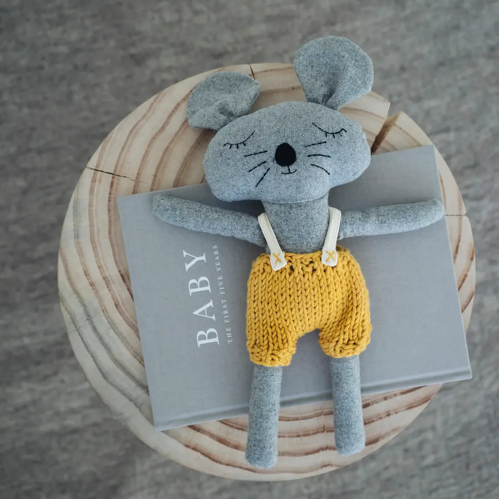 Charlie Mouse, one of our favourite forever friends. Made with the softest wool blend fabric, Charlie mouse wears knitted Australian merino wool overalls and loves collecting sticks and stones. He also enjoys cooking marshmallows over a fire and ice-cream cones. He doesn't like cabbage.