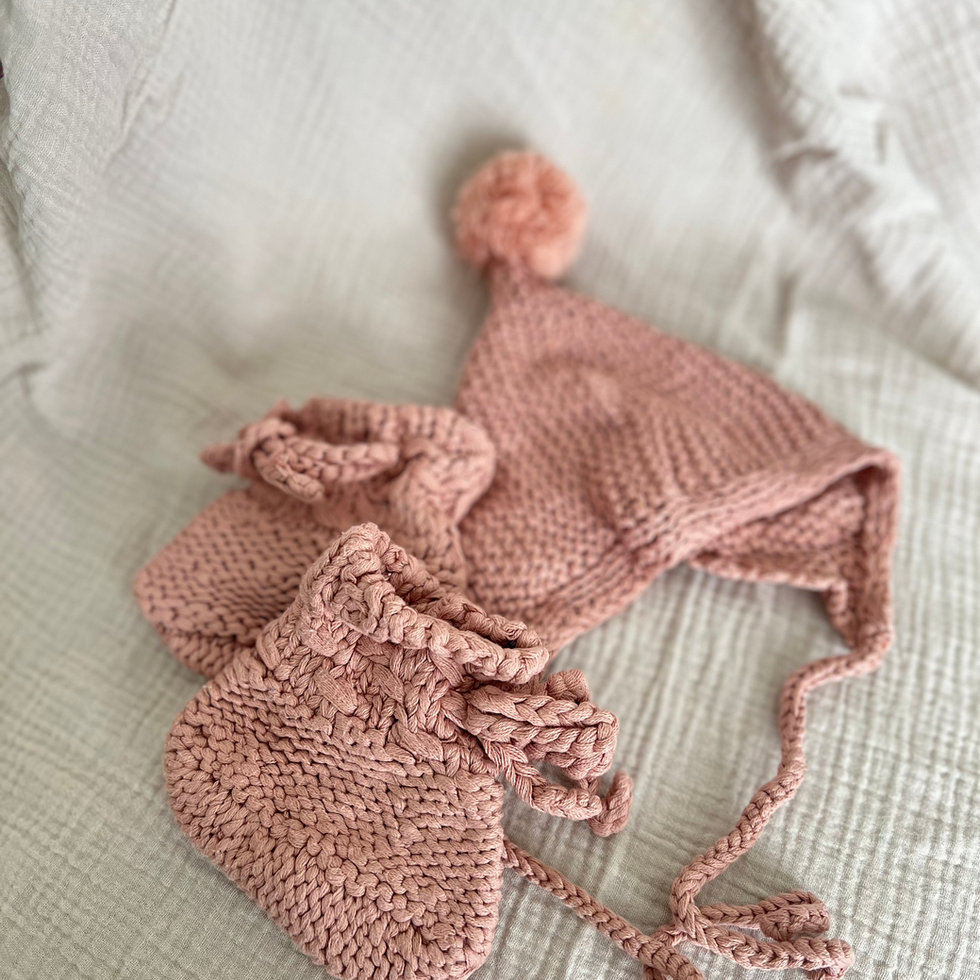 Keep baby cosy and cute in these Milk & Poppy baby bonnet & booties. An adorable set for announcement photos. Handmade from 100% organic cotton, designed as an ‘oversized chunky knit’ style for newborns that will fit for longer. Booties have an adjustable drawstring around the ankle to tighten to avoid slipping off.