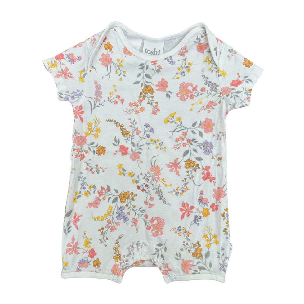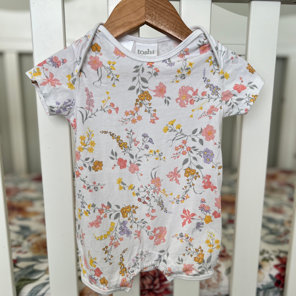 Discover the Toshi Isabelle short sleeve onesie – a perfect blend of style and comfort for your little one. This onesie, made from 100% cotton, features a gorgeous colourful floral print and is available in size 00. Designed with convenience in mind, it includes press studs for easy nappy changes. In a lightly worn condition, this piece ensures both practicality and an adorable look.